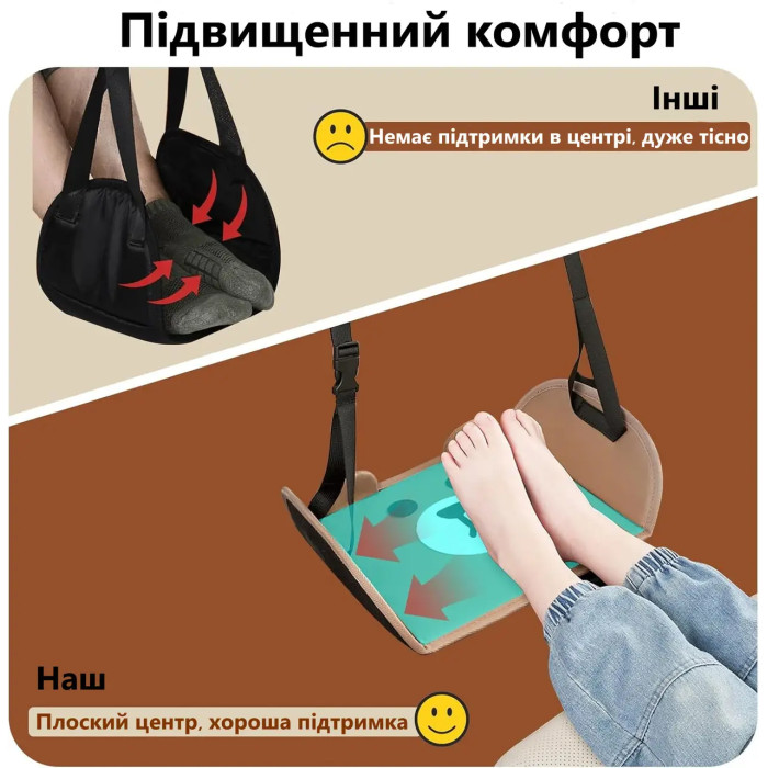 - Підвищений комфорт під час сидіння: Гамак забезпечує ефективну підтримку ніг, дозволяючи їм відпочити. Плоский центр надає хорошу підтримку, на відміну від інших моделей, які можуть бути тісними